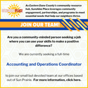 Sunshine Place provides comprehensive services that support essential needs through community engagement and partnerships. Through our own programs and onsite partner agencies, we provide one location where families and individuals in Sun Prairie and eastern Dane County can access resources and opportunities for help with food, housing, and other barriers to stability.
