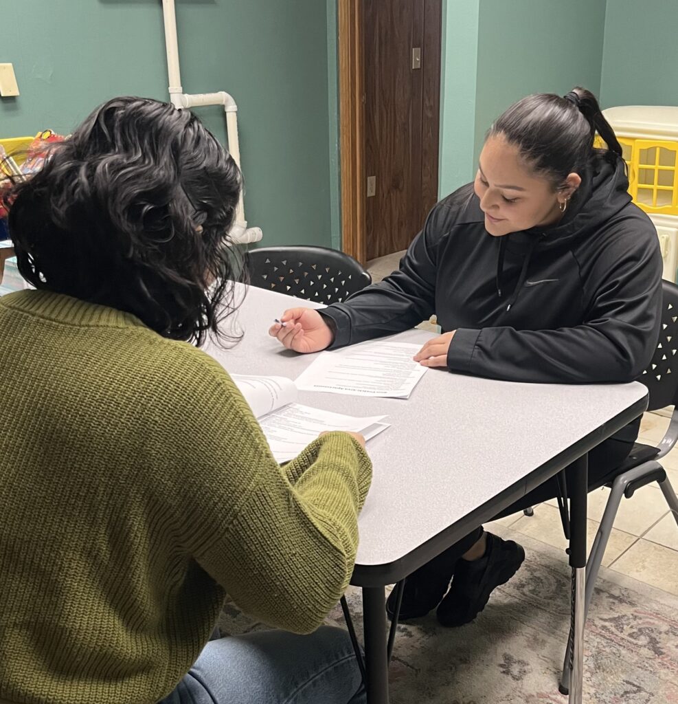 Two women sitting at a table with a blue tablecloth that reads "Sunshine Place" discussing housing options.