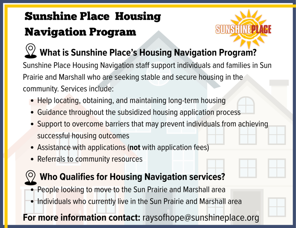 Through our housing services, Sunshine Place assists our neighbors in the Sun Prairie and Marshall area who are experiencing housing instability or the threat of utility disconnection.